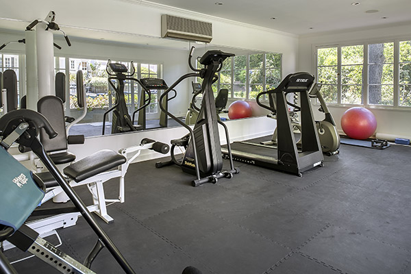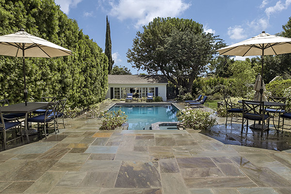 The backyard is recently renovated, very private paradise, featuring a gorgeous landscape and hardscape with numerous vignettes perfectly designed for sunning, al fresco dining and casual lounging in the outdoor living room. There’s built in barbecue area, an outdoor shower and vast, wide-open grassy expanses with plenty of room to run. As its centerpiece, the backyard features a sparkling saline pool and spa surrounded by open deck space. There’s also a very large gym tucked toward the rear of the yard designed for inspirational workouts enjoying vistas of these impressive grounds.